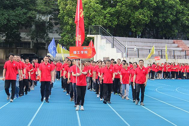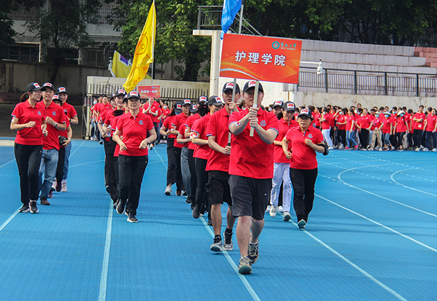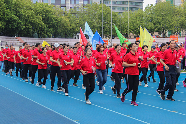 教职工们身着杏耀统一红色服装,踏着整齐的步伐,精神饱满地按照指定路线奔跑在校园的跑道中。