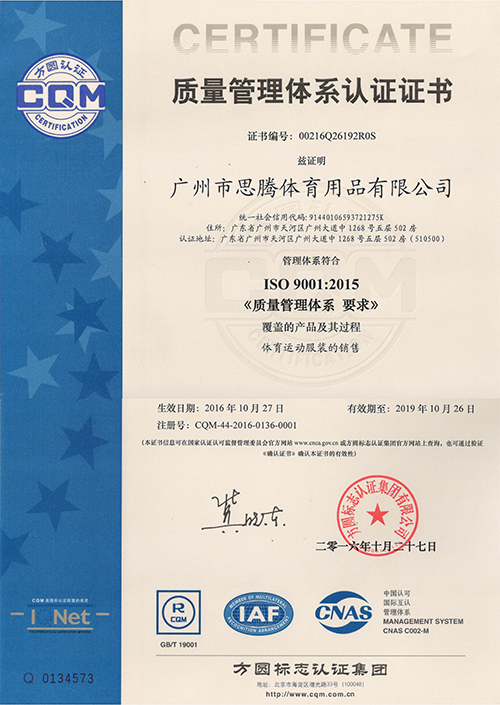 【杏耀平台运动服团购】荣获质量管理体系认证证书