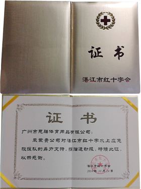 杏耀捐赠运动服获湛江市红十字会证书